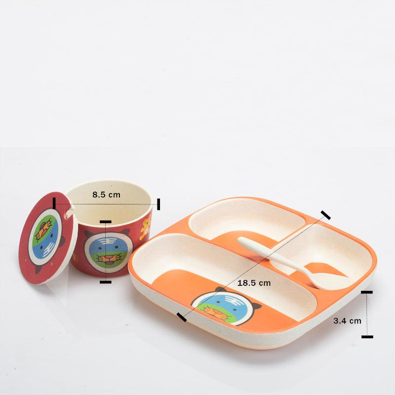 Make mealtimes easy and joyful with a bamboo kid's dinnerware set. Each bright and cheerful 3-piece set includes a matching divided plate, Pot with lid & spoon featuring fun themes and cute characters your little one is sure to love. Bamboo plates for kids & matching utensils are just the right size for little hands and are designed to help your baby, toddler or child get the knack of self-feeding.